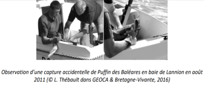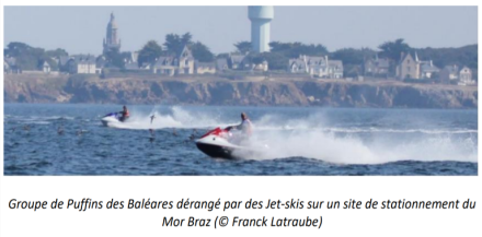 Selon le bilan du suivi protocolé de 2016 (GEOCA & Bretagne-Vivante, 2016), il semble que le dérangement de groupes de Puffins des Baléares soit limité en termes de fréquence, au regard du nombre relativement faible de pratiquants à l’échelle de la surface d’eaux côtières exploitées par l’espèce. Cependant, l’intensité du dérangement lorsqu’il intervient est probablement très forte. Un cas de dérangement significatif d’un groupe de Puffin de plus de 300 Puffins des Baléares par 10 Jet-Skis est notamment documenté dans le Mor Braz (Bretagne vivante/Geoca, 2016).
