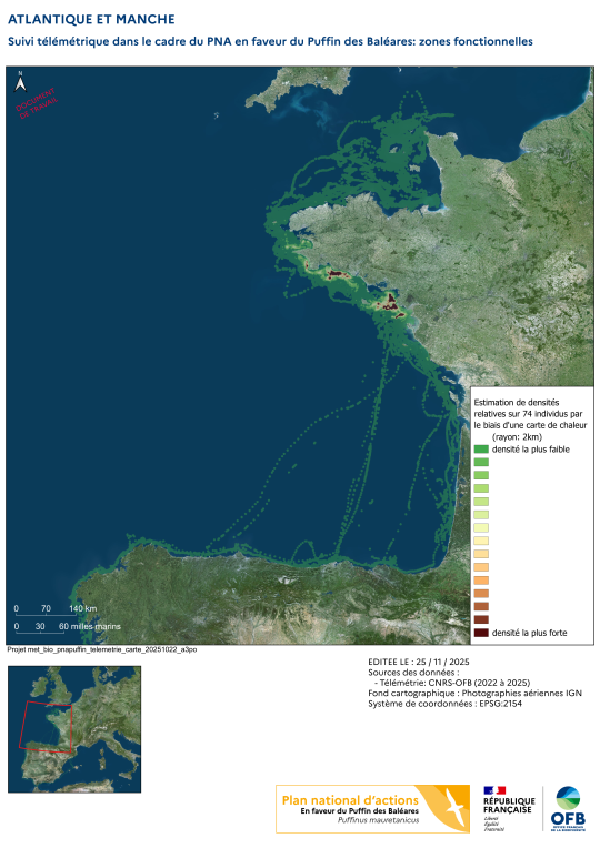 La stratégie de suivi du Puffin des Baléares élaborée au cours de la rédaction du PNA en faveur de cette espèce a identifié l’importance des suivis télémétriques pour l’acquisition de connaissances, encore lacunaires sur l’utilisation spatio-temporelle des eaux françaises (en Atlantique comme en Méditerranée) par le Puffin des Baléares, en lien avec son écologie alimentaire. Une action spécifique du PNA concerne la mise en oeuvre d'une mesure de suivi de l’espèce par bio-logging GPS, au travers d'un programme pluri-annuel. Une première année de test de la méthode de capture et de déploiement d'une première série de 10 balises GPS a été réalisée en 2022, sur un financement européen (FEAMP). Fort de ce succès, le programme a pu être reconduit annuellement depuis 2023, avec l'appui de différentes sources de financement (OFB, EDF-Re, EMYN).
